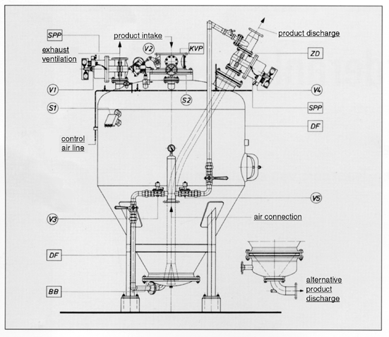The conveyor system consists of the pressure tank with all necessary instruments. It will be connected to the air pressure supply and the electric control.